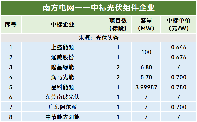 隆基绿能中标华润电力2024年第4批光伏项目光伏组件设备集中采购华北大区标段二、中广核新能源2025年度光伏组件设备框架集采包件1三标段、湖南能源集团红寺堡区新能源基地300万千瓦光伏复合发电(一期100万千瓦)项目光伏组件设备采购、中国大唐集团有限公司2025-2026年度光伏组件框架采购标段一N型、益阳市大通湖区河坝镇渔光互补光伏发电项目光伏组件设备采购等项目,中标单价均为0.705元/W。