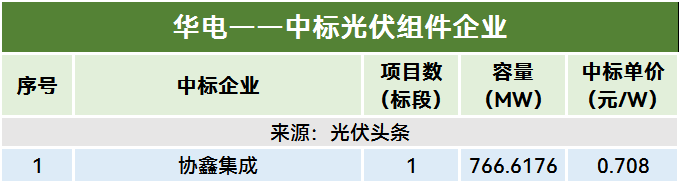 在本统计周期,华电共有1个项目(标段)定标,为四川华电凉山州盐源白乌二期等640MW光伏发电项目光伏组件采购,规模为766.6176MW,协鑫集成中标。