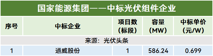 在本统计周期,国家能源集团共有1个项目(标段)定标,为国家能源集团国华投资2025年第一批光伏组件设备集中采购,规模为586.24MW,通威股份中标。