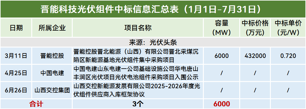 本统计周期,晋能科技中标晋能控股、中国电建、山西交控集团3个项目(标段),确定中标容量6000MW。