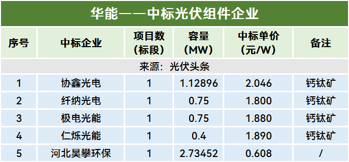 中石化、鞍钢集团、华能、中国中铁、中国电气装备集团、中国能建均有光伏组件项目定标。