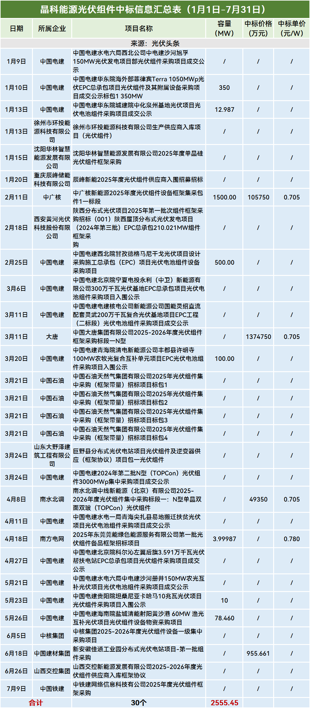 本统计周期,晶科能源中标中广核、中石油、黄河光伏、中国有色集团、中国电建、中国建材集团、中国铁建、山西交控集团等企业30个项目(标段),确定中标容量2555.45MW。