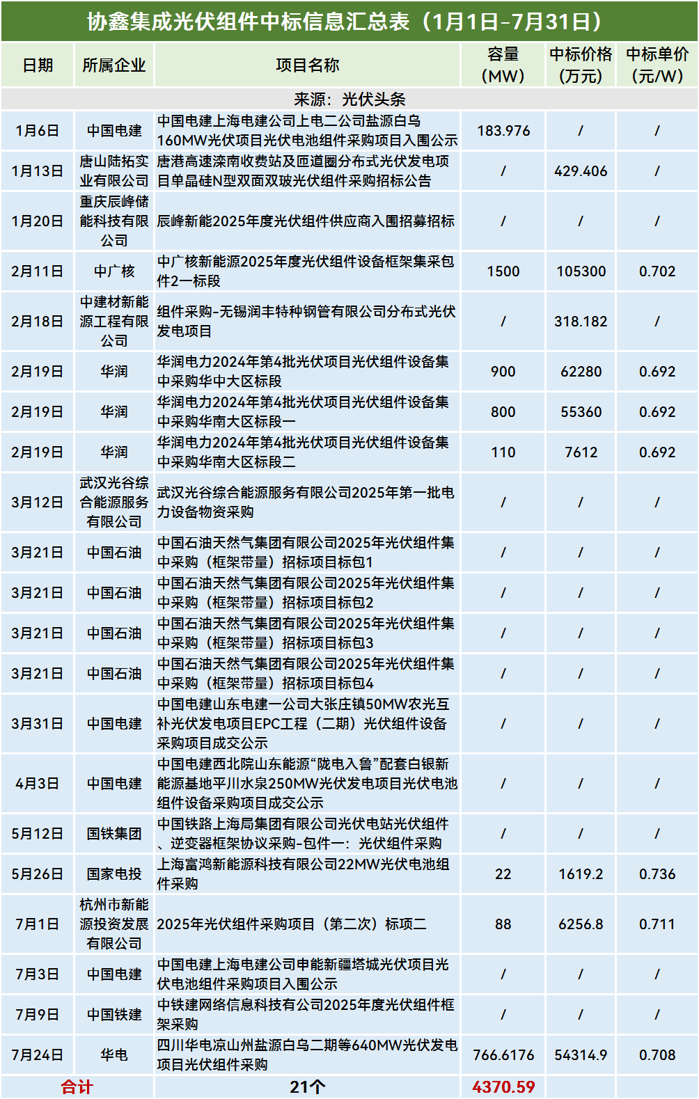 本统计周期,协鑫集成中标中国电建中广核、中石油、华润、国家电投、华电等企业21个项目(标段),确定中标容量4370.59MW。