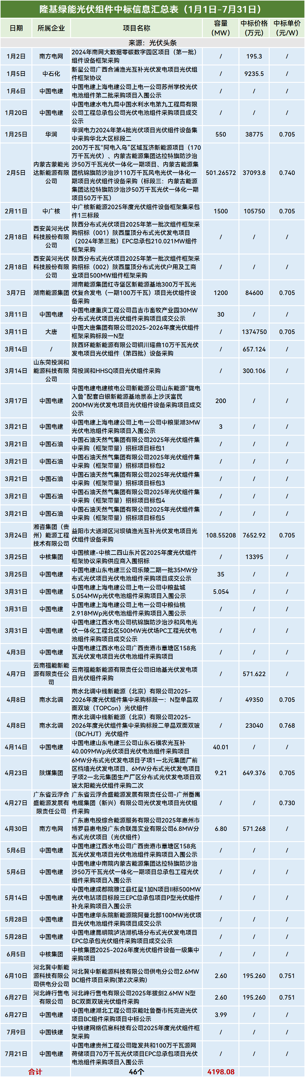 本统计周期,隆基绿能中标中广核、中石油、中国电建、大唐、中国铁建等企业46个项目(标段),确定中标容量4198.08MW。