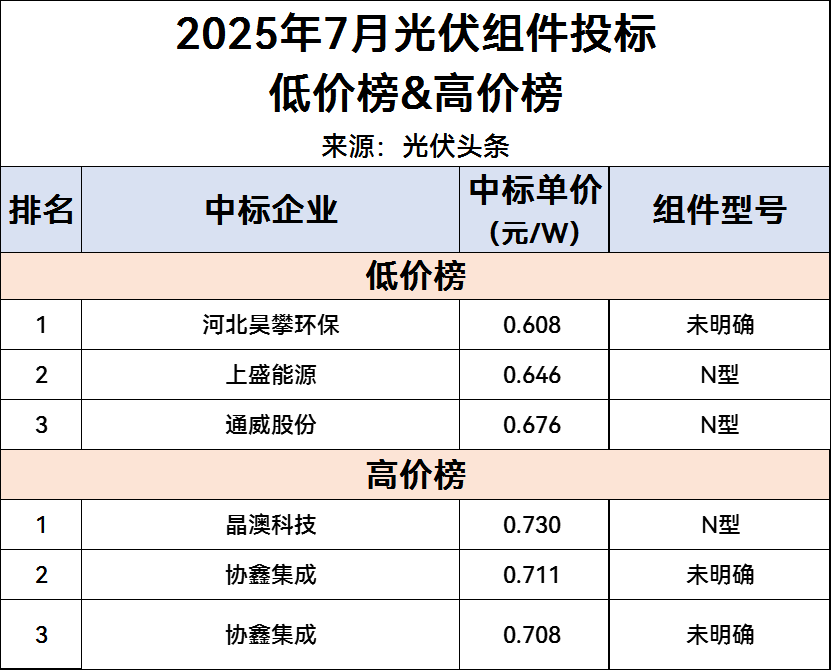 光伏头条根据企业入围组件招标项目候选人情况,制作2025年7月光伏组件投标低价榜&高价榜。详情如下: