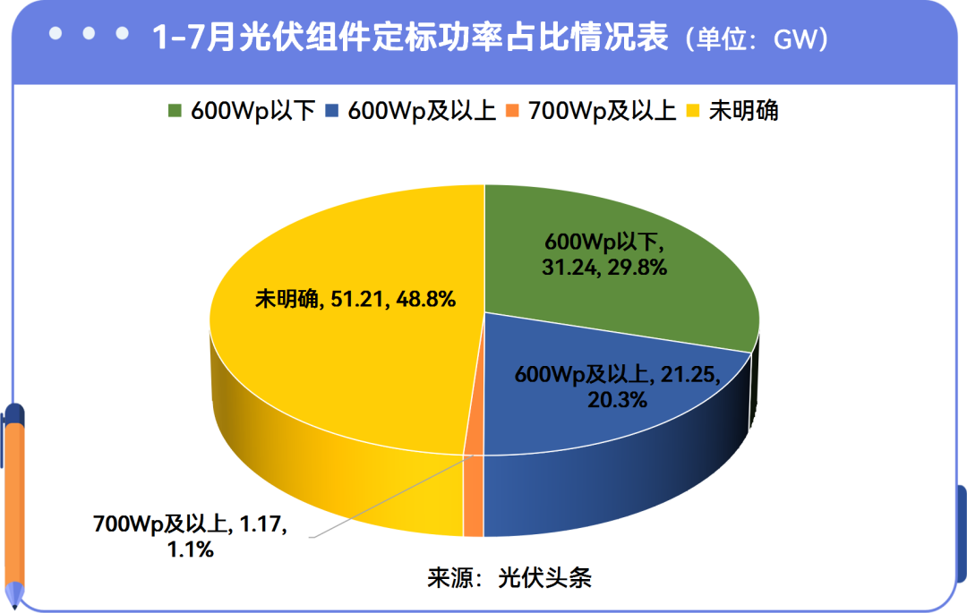 5、从功率要求而言,600W及以上光伏组件容量22.4GW,占比21.4%。