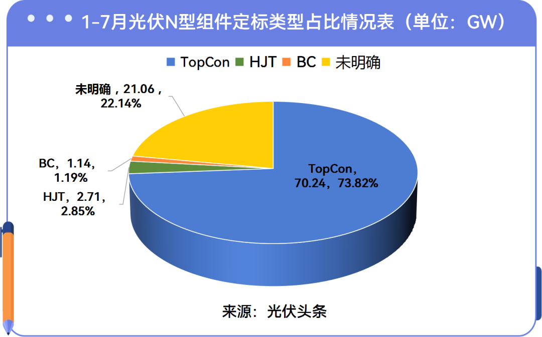 1-7月定标的N型组件中,TOPCon组件明确规模70.24GW,占比达到73.82%。