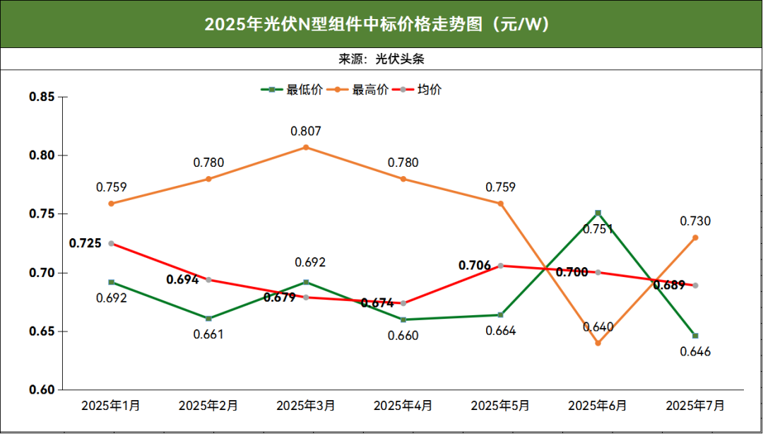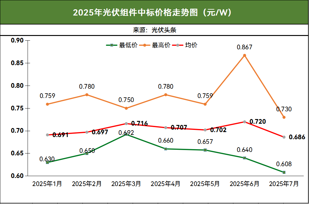 其中7月均价0.686元/W,最低中标价格0.608元/W,最高中标价格0.730元/W;6月均价0.720元/W,最低中标价格0.640元/W,最高中标价格0.867元/W;5月均价0.702元/W,最低中标价格0.657元/W,最高中标价格0.759元/W;4月均价0.707元/W,最低中标价格0.660元/W,最高中标价格0.780元/W;3月均价0.716元/W,最低中标价格0.692元/W,最高中标价格0.750元/W;2月均价0.697元/W,最低中标价格0.650元W,最高中标价格0.780元/W;1月均价0.691元/W,最低中标价格0.630元W,最高中标价格0.759元/W。(备注:除去钙钛矿、轻质组件等特殊组件价格)