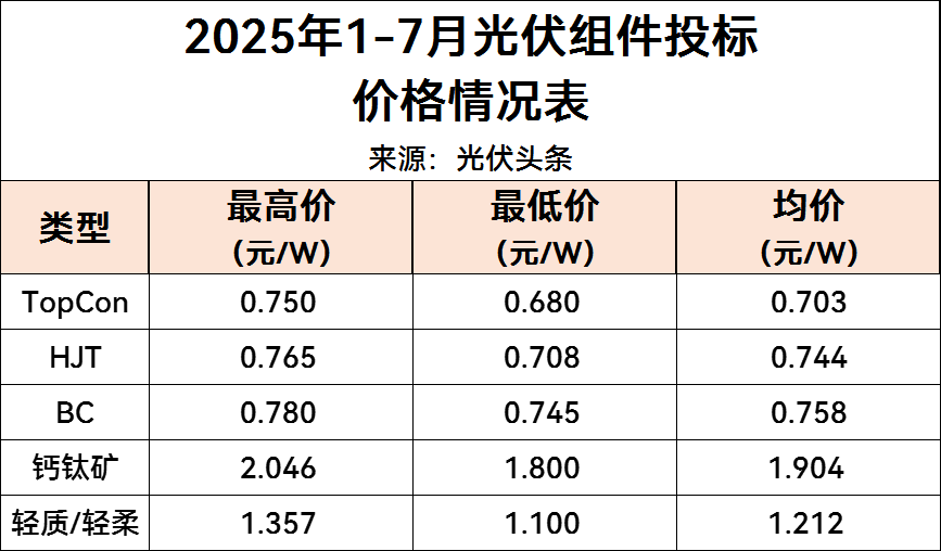 1-7月,TopCon组件均价为0.703元/W;HJT组件均价为0.744元/W;BC组件均价为0.758元/W;钙钛矿组件均价为1.904元/W;轻质/轻柔组件均价为1.212元/W。