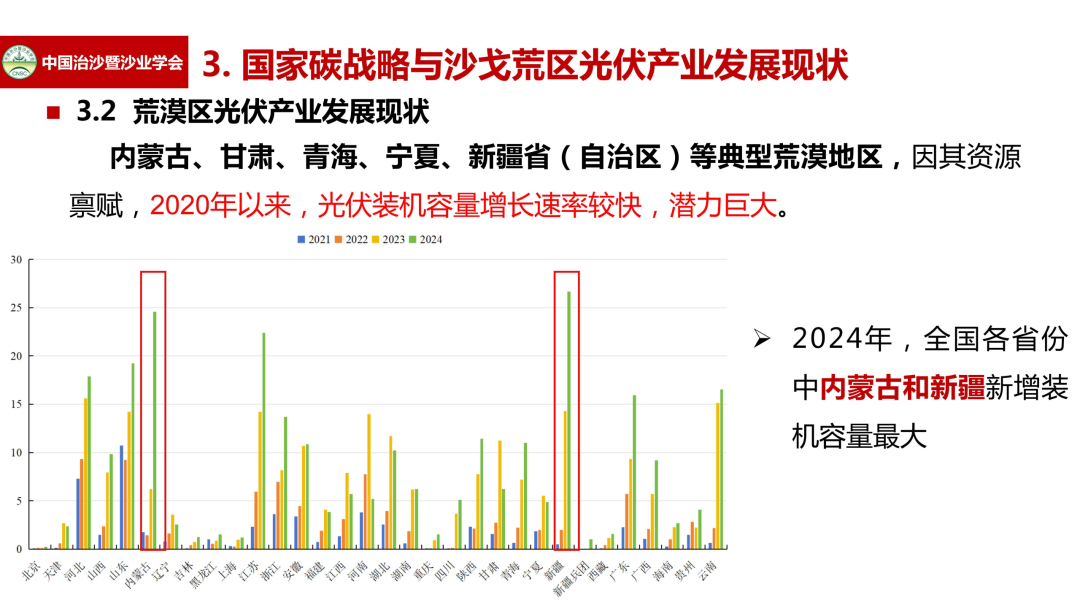 2021年,国家发改委等部门联合印发《“十四五”可再生能源发展规划》,提出加快推进以沙漠、戈壁、荒漠地区为重点的大型风电光伏基地建设,对荒漠区光伏产业发展形成有力支撑。内蒙古、甘肃、青海、宁夏、新疆省(自治区)等典型荒漠地区,因其资源禀赋,2020年以来,光伏装机容量增长速率较快,潜力巨大。2024年,在全国各省份中,内蒙古和新疆新增装机容量最大。