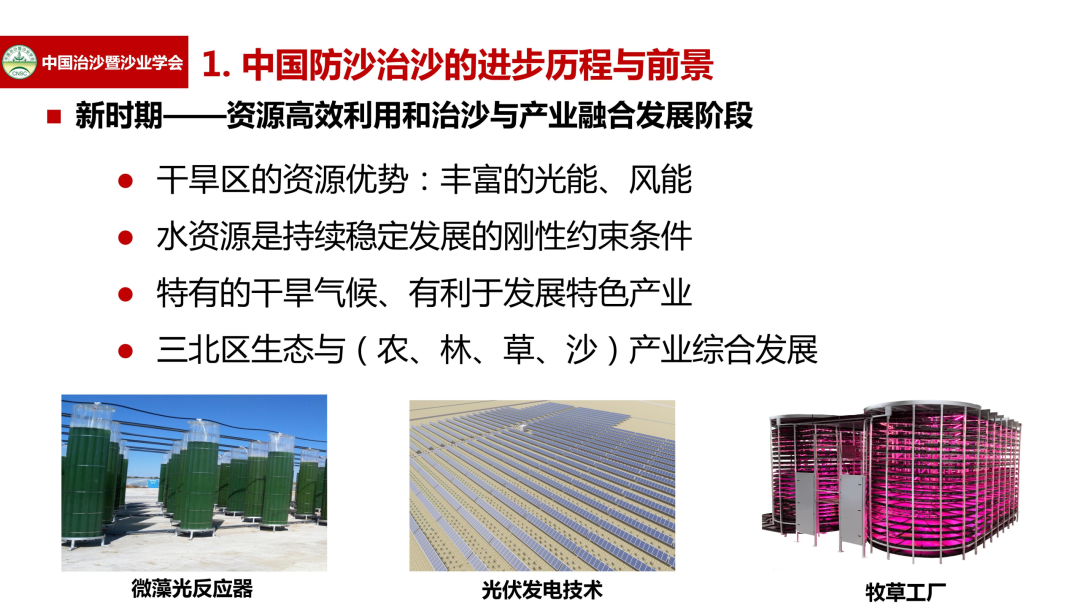 在我国防沙治沙进程的不断推动下,将迎来新时期——资源高效利用和治沙与产业融合发展阶段。杨文斌介绍,在该阶段,丰富的光能、风能成为干旱区的资源优势;水资源是持续稳定发展的刚性约束条件;特有的干旱气候、有利于发展特色产业;三北区生态与(农、林、草、沙)产业综合发展。