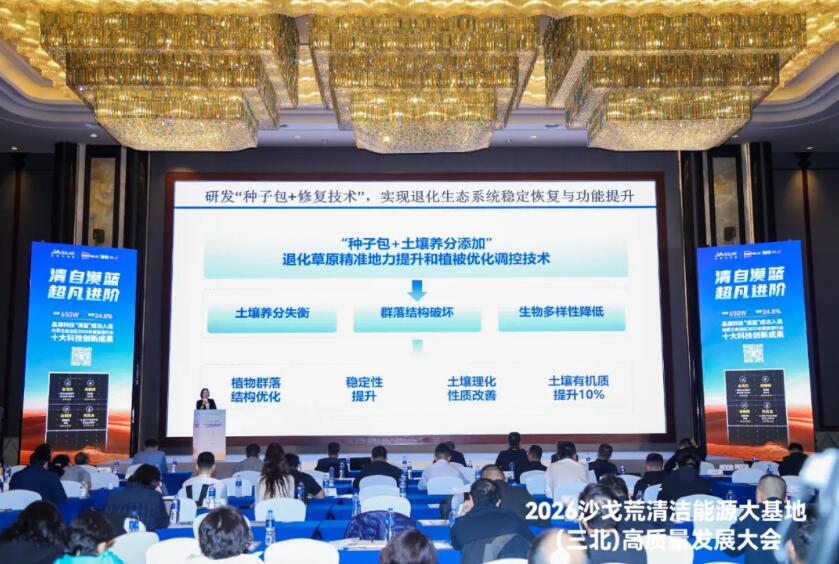 当日下午,蒙草生态环境(集团)股份有限公司副总裁张晚霞受邀出席为大家带来了题为《科技治沙创新突破——探索新时代治沙体系》的主题演讲。她从产品创新、机械装备、光伏治沙、沙化草地治理、种源保障到典型治理案例,详细介绍了蒙草集团在科技治沙方面的的最新实践与突破。