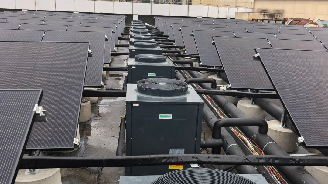该系统基于酒店实际用能需求,由清华大学博士后团队和国内知名建筑设计院联合设计,可全面覆盖客房、餐饮等多元用水场景,实现全时段稳定供热。在运行层面,通过““光伏发电+光热利用+热泵增效””协同机制,有效降低系统对外部电力的依赖。根据项目测算,传统电加热模式下年耗电量超过100万kWh,而PVT系统在叠加自发电后,实际用电量降至约9万kWh,年节省电量约98万kWh,整体节能率达到92%,显著降低酒店热水系统的运行能耗与用能成本。
