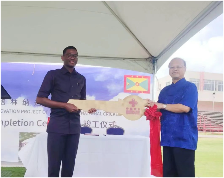 竣工移交仪式上,韦宏添大使将项目 钥匙 郑重交付米切尔总理,标志着这一中格友好合作的标志性成果正式落成。这座承载着两国人民情谊的现代化板球场,不仅将成为深化体育文化交流的实体纽带,更将化作推动双边关系全方位发展的强劲引擎,引领中格合作向着更高水平、更宽领域、更深层次稳步迈进。