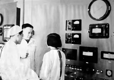 1959年,钱三强(左二)在重水反应堆控制室指导工作