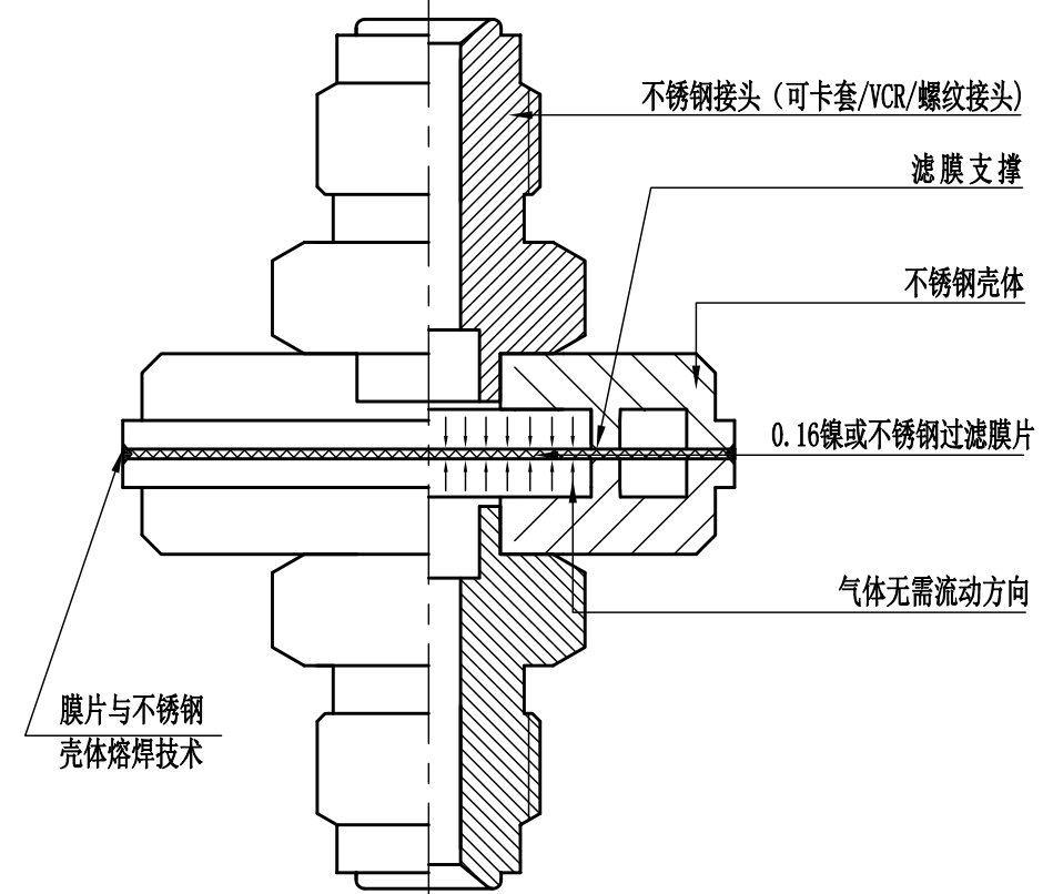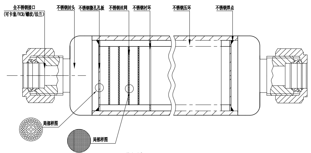 【主要特点】: *采用了全金属的滤芯,不锈钢过滤器耐高温,最高耐温达800℃。 *滤芯采用高真空粉末冶金而成过滤精度最高可达0.3m。 *由于采用了金属芯,过滤器可以反吹除所阻挡的尘埃,可长期不用更换滤芯反复使用。 *低泄漏率(真空氦检可达10-10Pa.m3/s)。 *高耐压,最大可达12.0MPa。