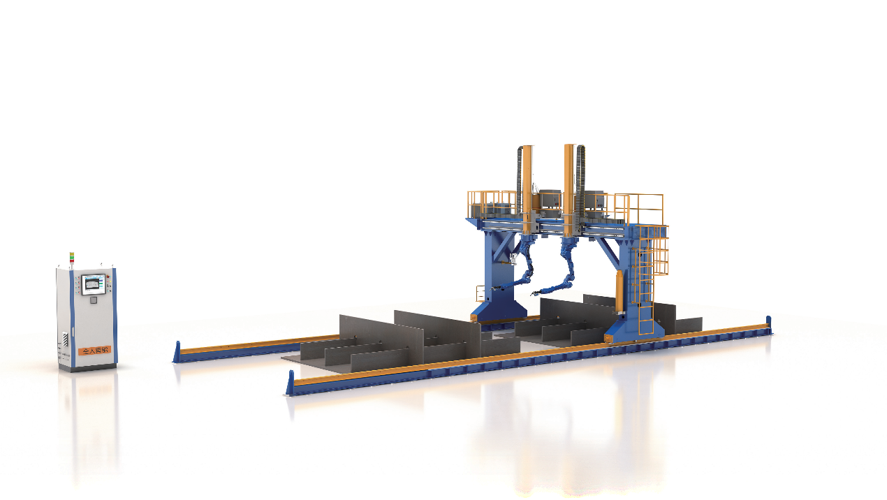 【主要特点】:悬挂式九轴联动极大增加焊接范围可达性。 *可实现双机对称焊接、单机独立焊接的灵活配置。 *尤其适应大型钢结构件的无人化智能焊接需求。