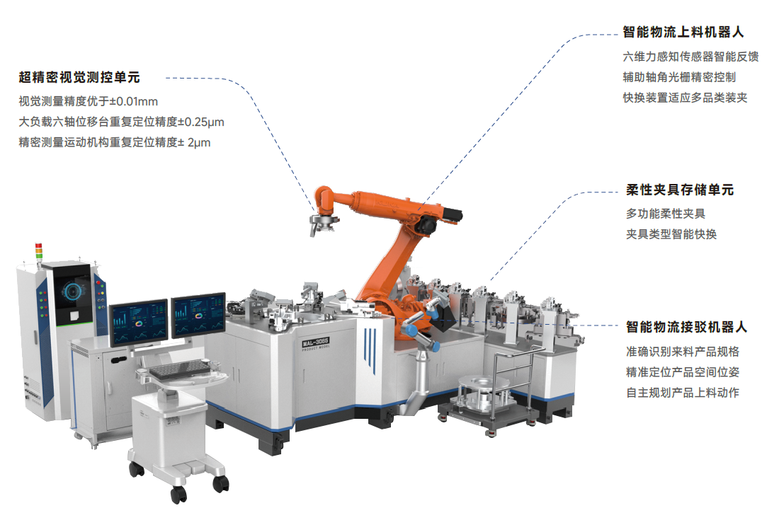 【主要特点】: *微米级运动精度和视觉测量精度实现超精密智能装配。 *作业过程实时镜像展示,虚实结合、直观、便捷。 *视觉智能实现工件认的准、抓的准、装的准。