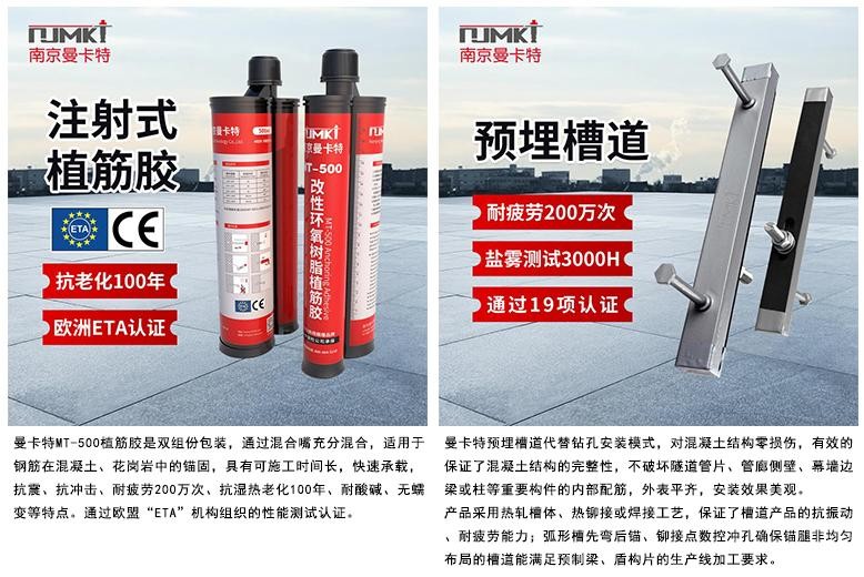 南京曼卡特科技有限公司成立于2004年,是一家专业从事高科技锚固、加固材料研发、生产、销售,并为项目提供设计构思、施工方案和技术指导等一站式服务的高新企业。