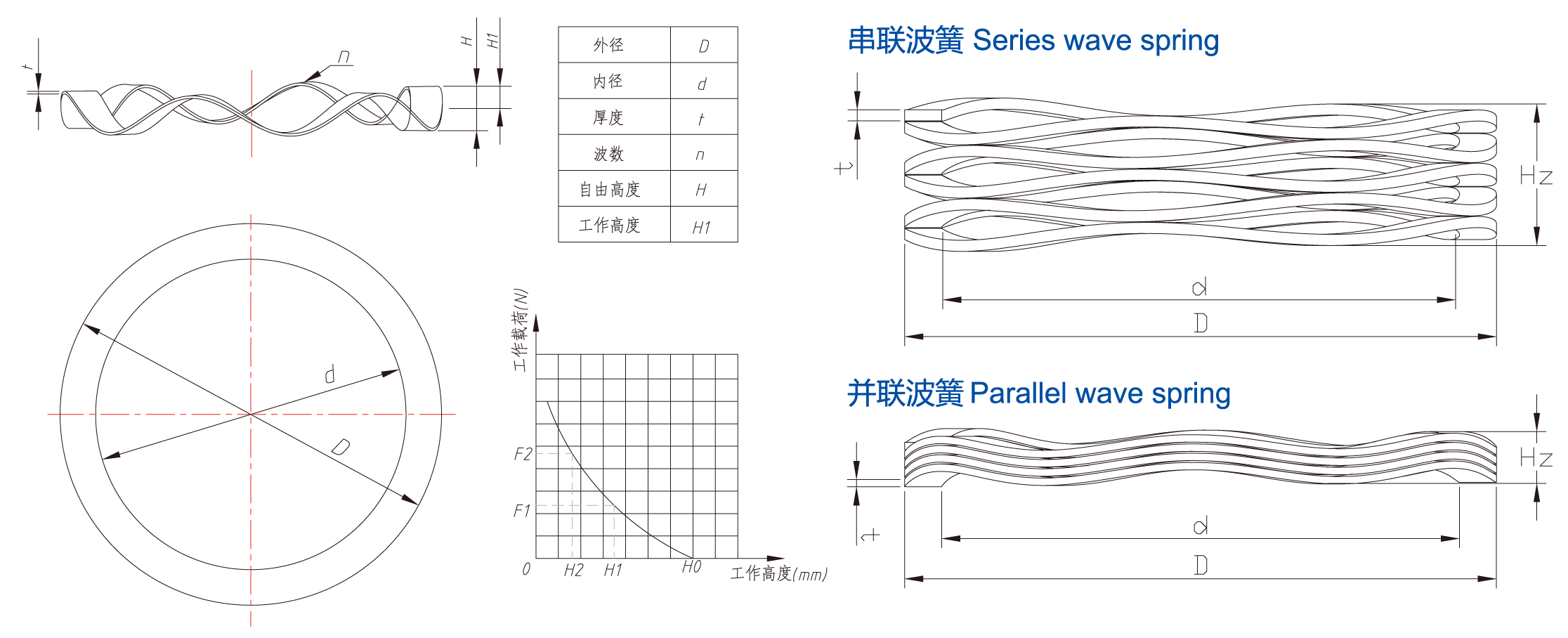 【产品描述】: 波形弹簧简称波簧,在金属圆环上加工有若干峰谷的弹性元件。本公司生产的波形弹簧分单层(开口、闭口)波形弹簧、多层波形弹簧。单层波形弹簧可执行标准为JB/T 7590-2005,HG/T 2479-2003,也可代为设计、制造各类非标准波形弹簧。鉴于国内没有统一的多层波形弹簧标准,公司可根据客户要求生产或代为客户设计、制造各类多层波形弹簧。