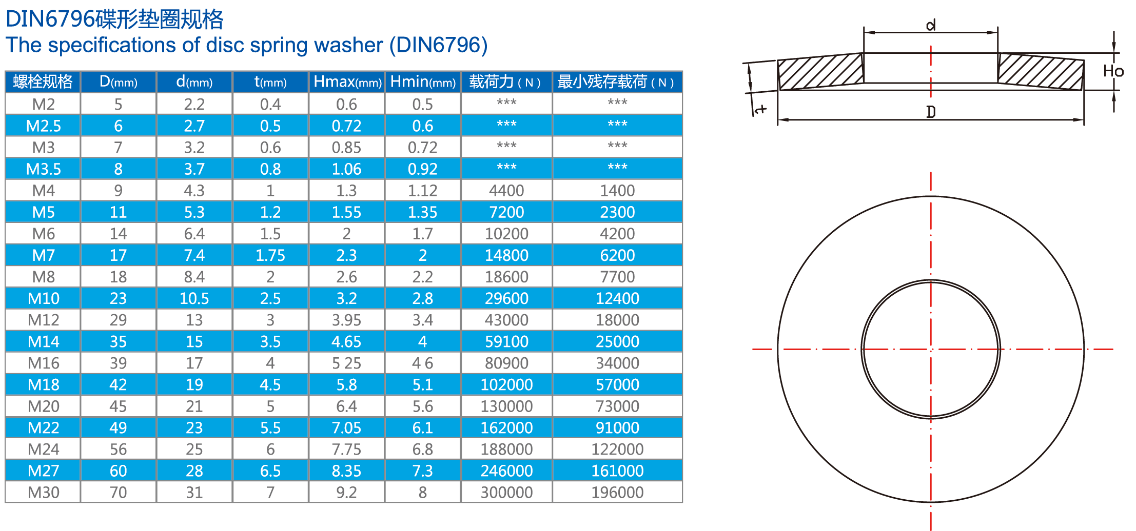 【产品描述】: 碟形弹簧垫圈又称螺栓连接用碟形弹簧垫圈,依照DIN6796制造生产。用于各种强度螺栓、螺钉的连接,对于预防拉力的松弛、对易损件的磨损及蠕变,热膨胀收缩及密封件的压力起到补偿作用。