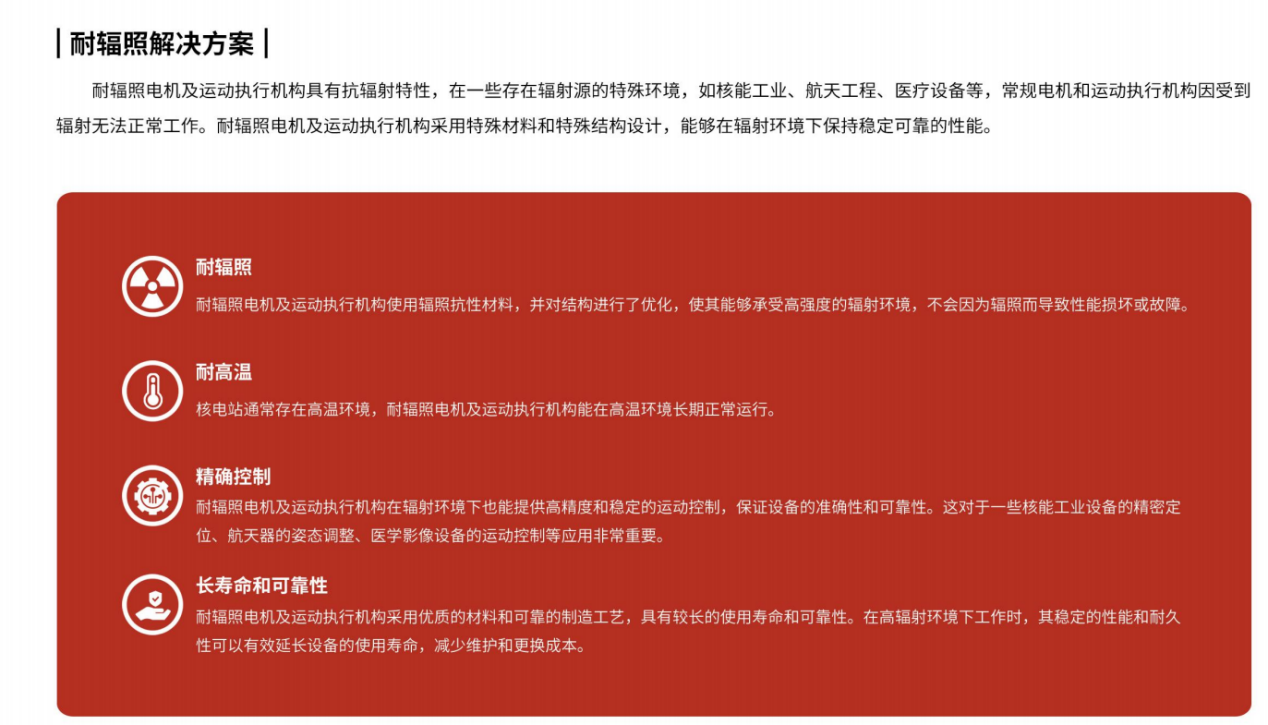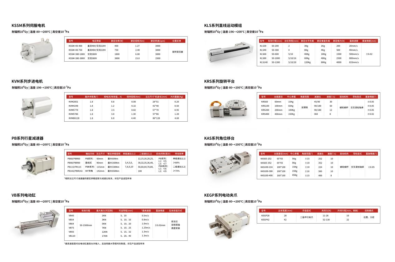 主要产品包括真空高低温耐辐射步进电机、伺服电机、减速器、电动缸、直线运动模组、多自由度运动平台、电动夹爪、电机驱动器、运动控制器等,为客户提供完整的极端环境自动化解决⽅案。