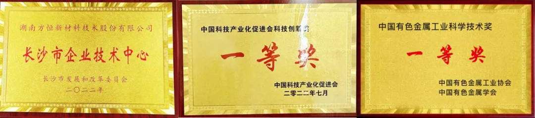 方恒新材以技术创新为发展内核,金属材料复合制备关键技术指标达到国际领先水平,荣获中国有色金属工业科学技术一等奖两项、中国科技产业化科技创新一等奖,七类产品摘得中国国际高新技术成果优秀产品奖。作为行业标准的制定者,设有专家、博士工作站,建有省、市级企业技术中心,高能率技术加工中心,层状金属复合技术检测中心。累计申请复合技术相关专利50余项,其中已授权专利25项。