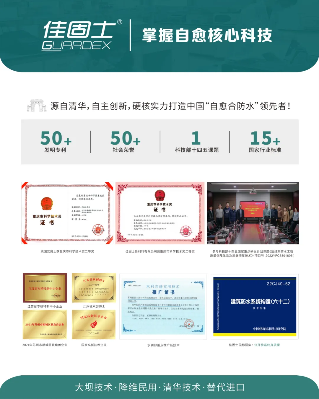 佳固士公司起源于清华大学水利水电工程系,秉承行胜于言、科技报国的理念,对标国际百年工程,突破了混凝土自愈合防水核心技术,使混凝土裂缝自修复指标远超国际先进水平,推动中国防水材料进入自愈合防水时代,助力地下工程防水与建筑结构同寿命,并率先以该技术研发出多系列防水产品,申请近百项国际国内专利,成为中国自愈合防水领先者。
