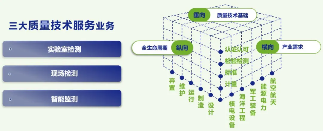 依托国家海洋设备质量检验检测中心等五个国家级创新平台,面向核电行业提供全生命周期的一站式、一体化质量技术解决方案,满足客户综合性、定制化质量服务需求。