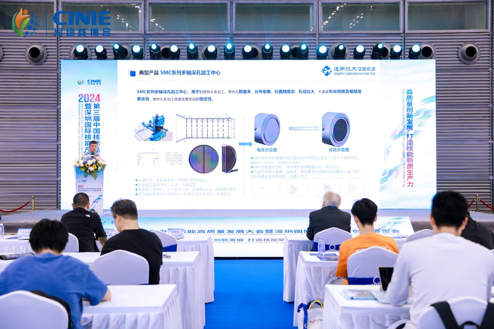 通用技术集团沈阳机床有限责任公司展示了该公司SMC系列多轴深孔加工中心在国产装备在核电领域的探索与应用,以高精、高效、高刚性、高稳定性、无措加工的产品水平达到国际先进水平。