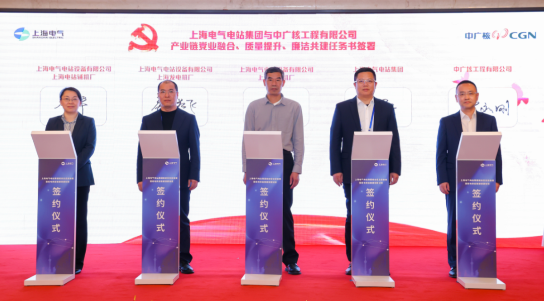 论坛最后,中广核工程联合上海电气电站集团等5家企业开展党业深融共建活动,签署华龙一号党员攻坚先锋队2025年攻坚任务,对设备交付、科研计划、现场服务中心成立、到货类NCR数量下降等方面任务进行了部署,以推进产业链伙伴间的高质量合作,为打赢华龙一号批量建设攻坚战奠定坚实基础。