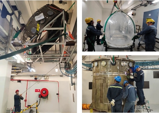 中微子探测器包含众多设备,需通过多处环境复杂的受限吊装口进行引入。项目组以丰富的吊装经验和扎实的吊装技术,确保各项物项在吊装和运输过程中按照既定方案一次就位。