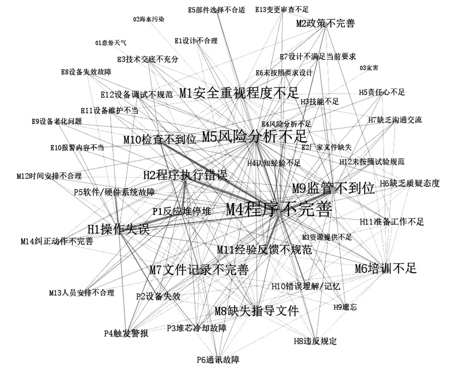 对于事件相似度大于0.4且有较多相似事件的具体事件,将其与影响核电安全的致因因素进行对应,规范表达[18]。将事件报告抽取结果所得的演化事件进行归一化处理后存储到Gephi软件[19],得出核电事故的复杂网络,其中包括738事件对,见图2。