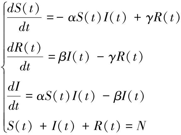 SIR模型规定了三种状态的人,包括健康状态、感染状态和免疫状态[11]。其中S代表处于健康状态的人群,I代表已感染的人群,R代表免疫人群,见图1。根据SIR模型做如下假设: