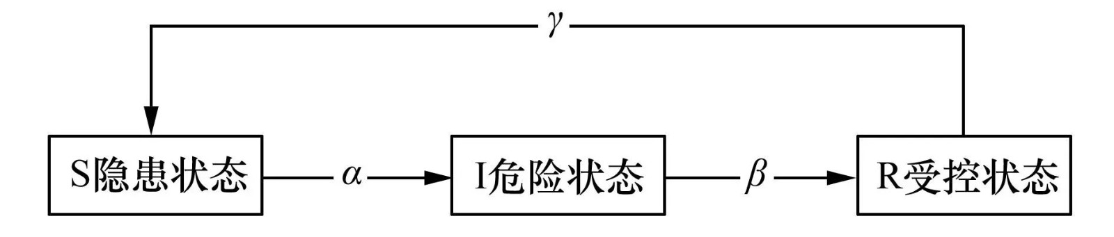 结合核电致因网络中各个事件节点的变化特性,将其分为三种状态:隐患状态、危险状态、控制状态[20]。潜在的隐患状态节点通过与其他节点不断地接触,产生被传染的概率,即网络中存在的风险感染率。设间隔时间t内所有可能发生接触的节点数为S(t)I(t),则实际发生传染的节点数为S(t)I(t),这部分代表隐患状态节点减少的数量与危险状态节点增加的数量。同理受到恢复率的影响,同一时间内危险节点数减少I(t),这部分节点进入受控状态。在此基础上引入的免疫缺陷率使得有R(t)个受控状态节点在间隔时间t内重新变为隐患状态。