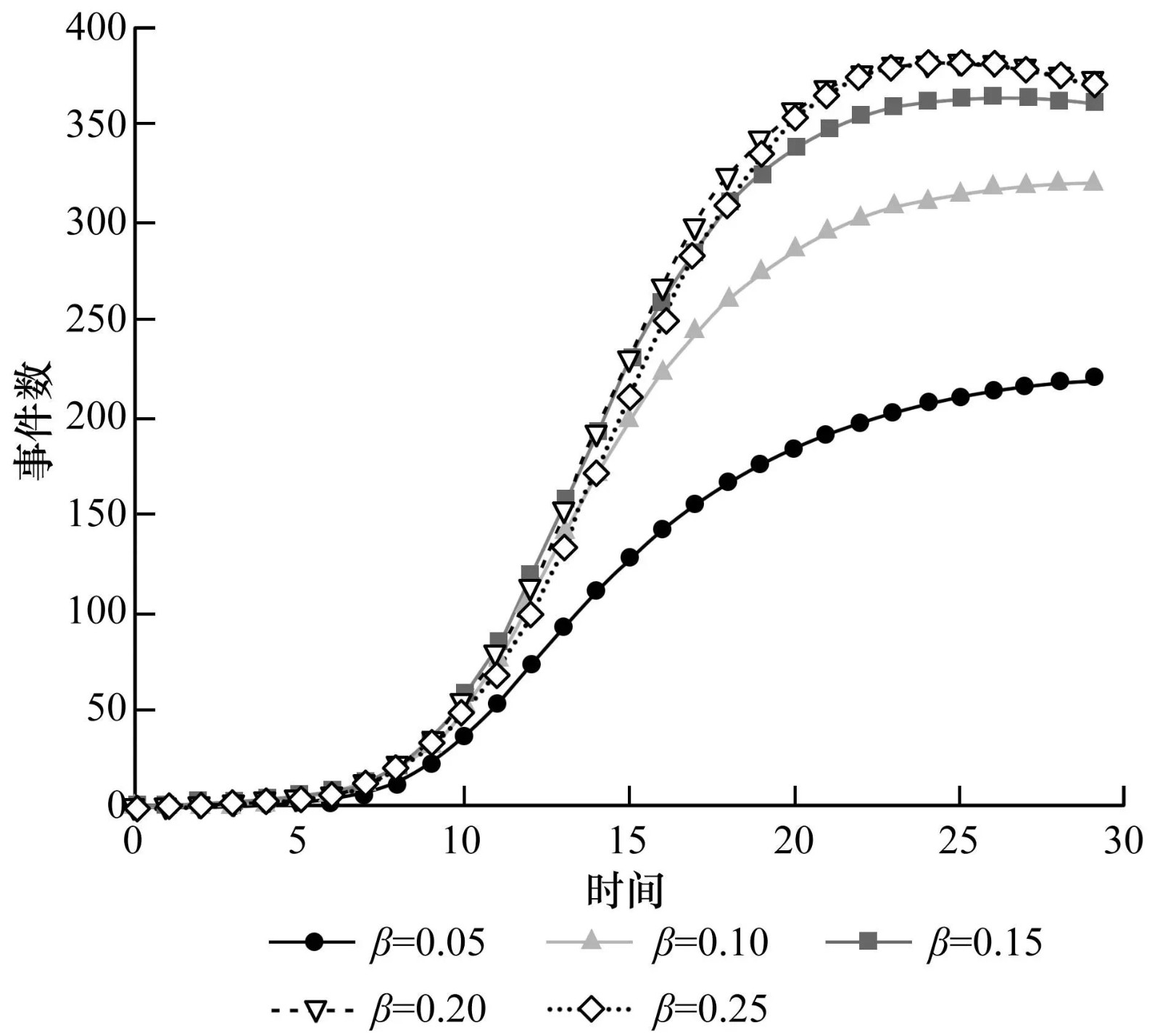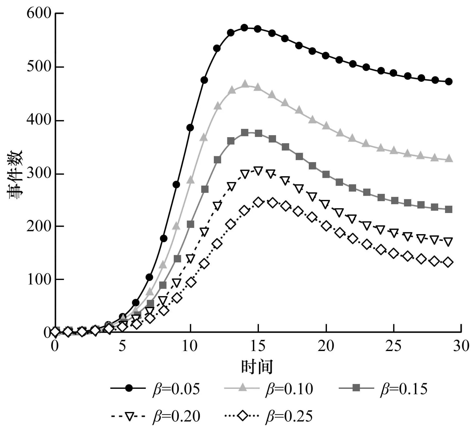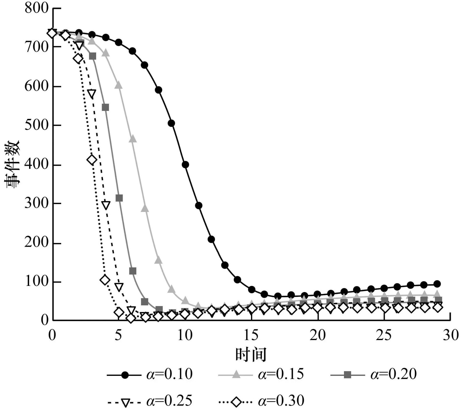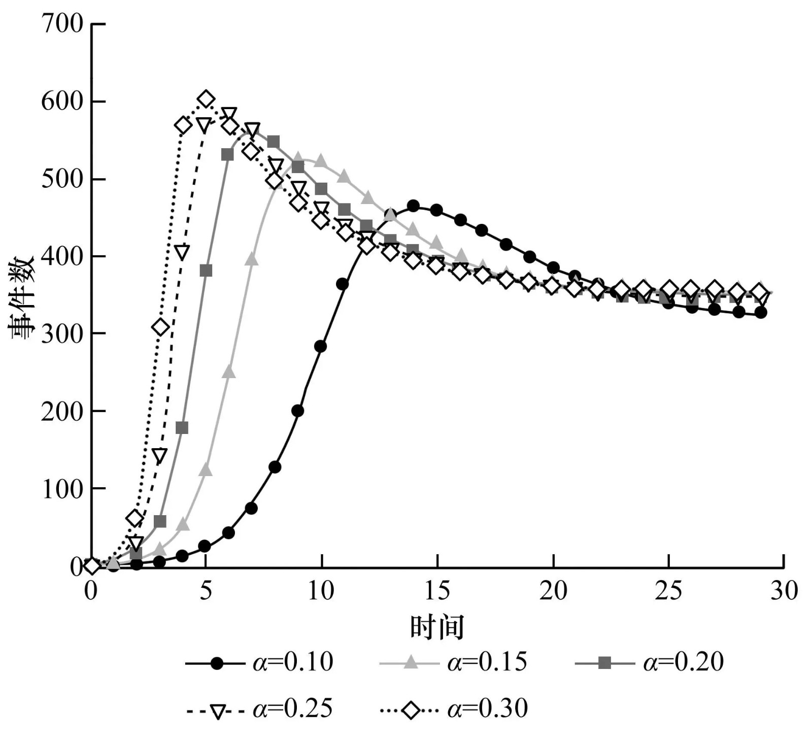 危险状态事件数的具体变化为,当=0.10时,在t=14时达到极大值464。当=0.15时,在t=9时达到极大值527。当=0.20时,在t=7时达到极大值564。当=0.25时,在t=6时达到极大值589。当=0.30时,在t=5时达到极大值608。与之前不同的是,感染率的降低不仅降低了稳态内危险状态事件数量,同时增加了系统达到最终稳态水平所需的时间。综上可知,风险感染率与核电系统安全呈负相关,感染率越大,核电安全越难以控制,且危险状态下的节点变化速度更大,数量更多。