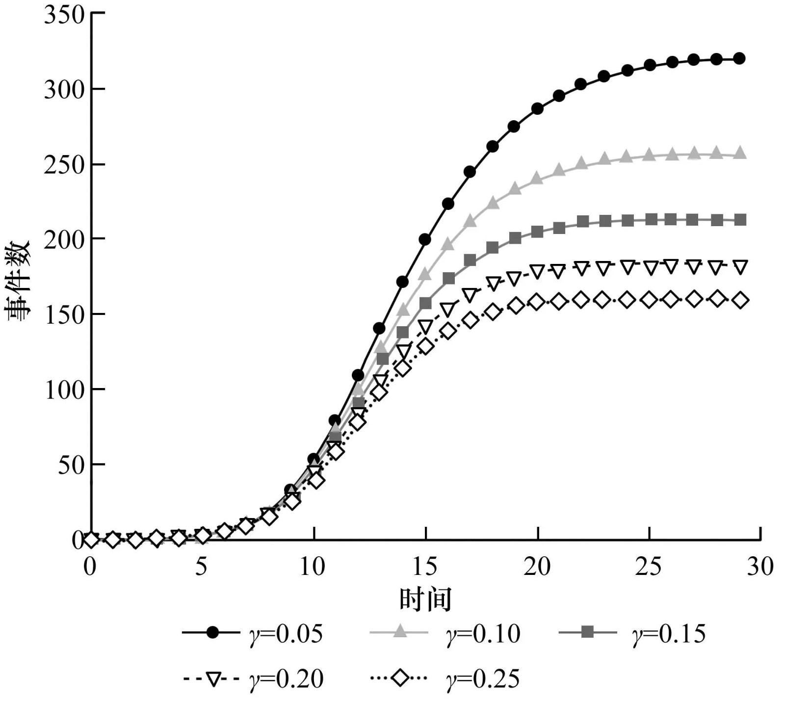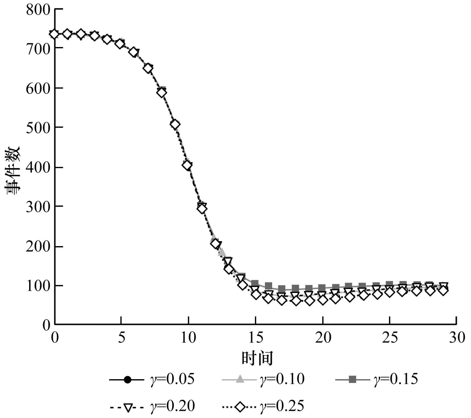 由仿真可得出,当=0.10时,隐患状态事件数在t=18时达到极小值61。当=0.15时,隐患状态事件数在t=12时达到极小值32。当=0.20时,隐患状态事件数在t=9时达到极小值20。当=0.25时,隐患状态事件数在t=8时达到极小值14。当=0.30时,隐患状态事件数在t=6时达到极小值10。分析数据变化可知,感染率对风险传播速度和高度的作用较为显著。随着的增大,系统受到的风险冲击更大,隐患状态事件数量下降得更快。系统的感染率越大,那么当危险发生时,留给操纵员用来反应事件的时间越短,此时核电系统的安全可控性越差。