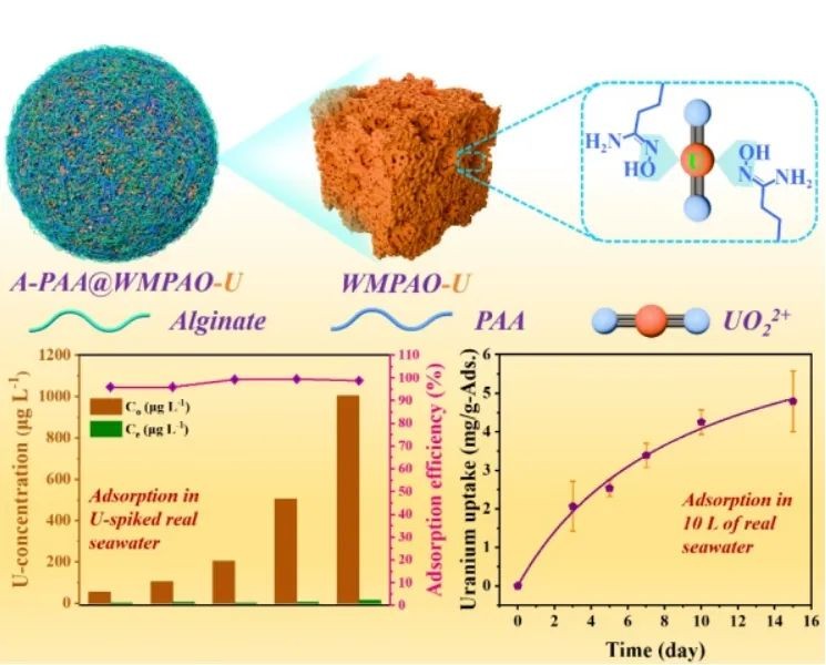 近日,中国科学院大连化学物理研究所研究员陈吉平团队在海水提铀研究方面取得进展。该团队利用精心设计的蜡铸造法和相转换过程,制备了具有大孔结构的聚偕胺肟(WMPAO)水凝胶粒子,并将WMPAO包覆进海藻酸-聚丙烯酸(A-PAA)球中,制备了A-PAA@WMPAO复合球材料。该复合球材料可用于海水中铀酰离子的富集分离。
