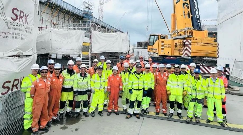 中核华兴项目建设团队秉承中核集团重大工程精神,以协同合作为导向,组织小规模团队建设,开展中方工人语言培训,项目团队从最初仅6名中方人员逐步扩展至30余人,全力保障现场工作高效开展。在第二个大罐吊装准备期间,项目部遭逢英国达拉(Darragh)风暴,现场风速峰值一度达到145公里/小时。项目团队主动协调业主与吊装分包商,抓住风暴间隙,在2024年圣诞现场封控前,一举完成大罐吊装工作,获HPC业主方NNB公司核岛总经理与储罐项目经理高度赞扬。