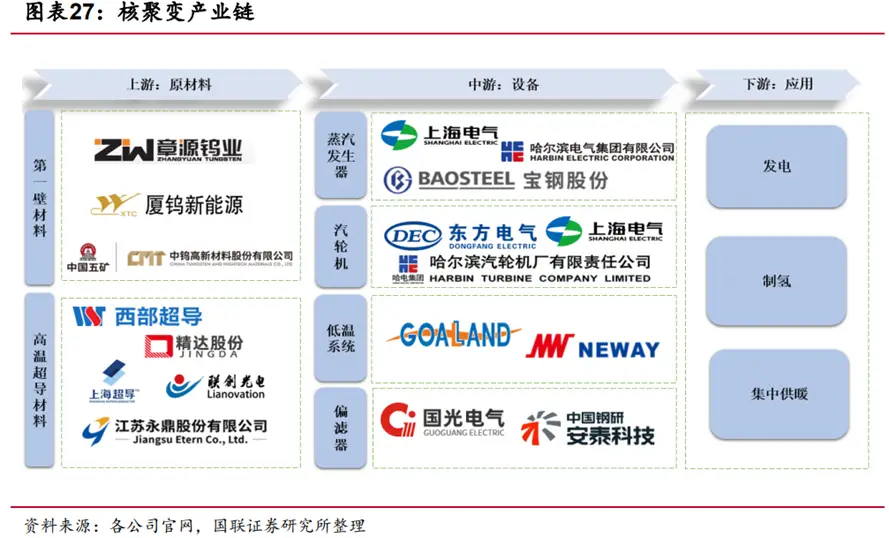 首先,核聚变发电的经济效益不言而喻。与传统的化石燃料相比,核聚变反应释放的能量更为巨大,且原料丰富,成本相对较低。一旦实现了商业化运行,将大幅降低电力成本,从而减少工商业生产和居民生活的能源支出,提高整个社会的能源使用效率。同时核聚变发电站的建设和运营也将带动相关产业链的发展,以下是来源于国联证券研究所整理的部分上下游产业的相关公司,这些企业为社会创造大量就业机会,促进了国民经济的增长。