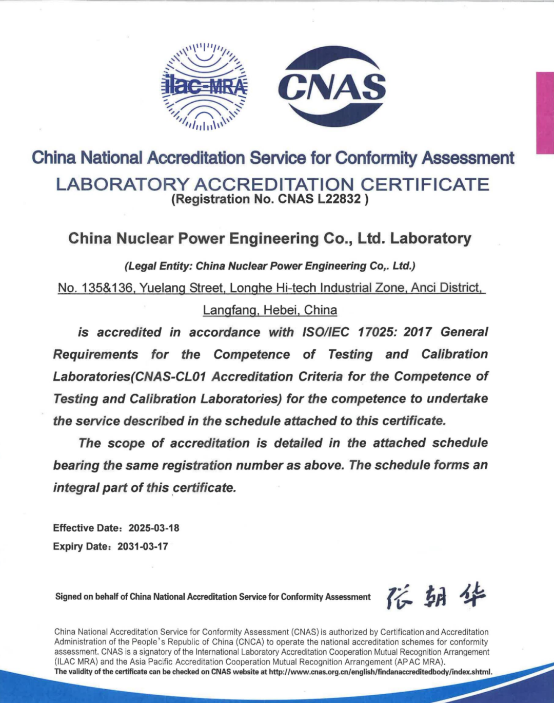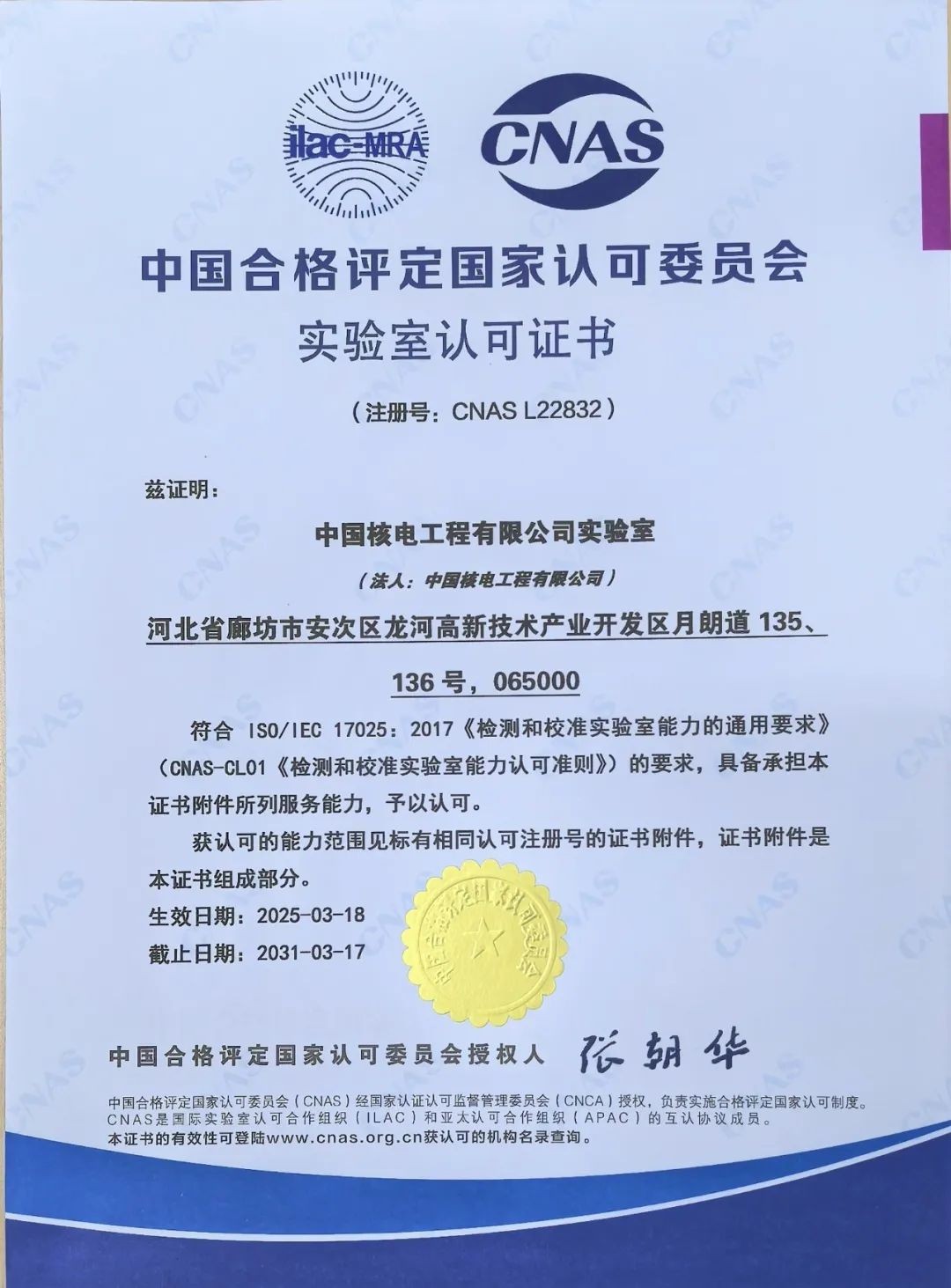 在全球化竞争和技术迭代加速的今天,企业能否在市场中建立可信赖的品牌形象、突破技术壁垒、实现高质量发展,已成为决定其生存与发展的关键,实验室的技术能力和检测结果的公信力也已成为企业、行业乃至国家竞争力的重要体现。中国合格评定国家认可委员会(CNAS)作为我国实验室认可的权威机构,通过严格的标准和规范化的流程,为实验室的技术能力、质量管理和社会价值提供权威背书。中核工程实验室获得CNAS认可,不仅代表着实验室的检测能力获得国家及国际互认,更象征着中核工程在质量管理和社会责任领域的卓越追求。