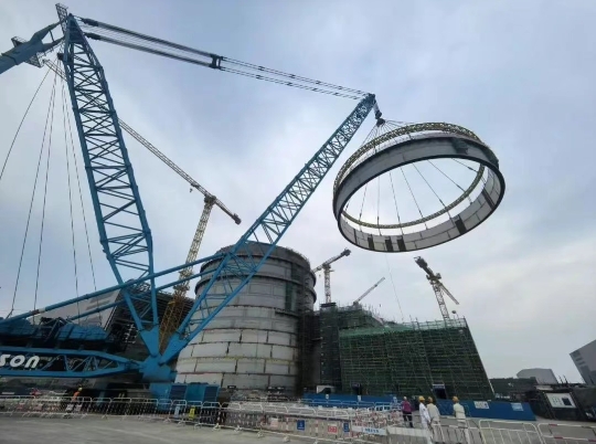 本次吊装的SC13-14层模块充分秉承应模尽模理念,进一步提升了屏蔽厂房建造效率。该模块由两层24个子模块拼装而成,整体呈圆筒型,外径约40米,高约7米,吊装重量超过600吨。相比3号机组的单圈工艺,4号机组SC13-14层采用双圈拼装、吊装工艺,模块化程度更高,可减少一次SC模块整体运输、吊装,减少一圈SC现场安装环焊缝,进一步提升了高空作业的安全。