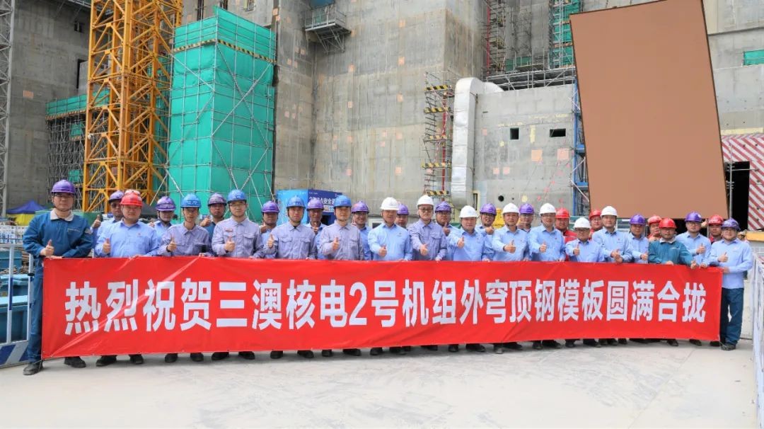 项目建设过程中,中核华兴三澳核电项目部坚持高标准、严要求,时刻紧盯目标,重点工作专人跟踪、难点工作专项推动,确保进度全面可控;创新施工工艺,首次使用了原位安装逆拼法施工,将外穹顶钢模板直接在原位进行自上而下、自下而上同步分层安装,有效规避了施工碰撞,克服了传统穹顶施工占用场地大、吊装风险高、工期冗长等弊端;大力推进微创小改,优化外壁连接件,有效了提高施工效率,采用可循环使用的临时吊耳,减少了吊耳焊接量80%;始终坚持党建引领,充分发挥党组织的政治优势、组织优势,全力解决施工难题,推动党建与现场生产工作有机融合,最终高效完成了2号机组外穹顶钢模板合拢,绝对工期同比1号机组节约了25天。