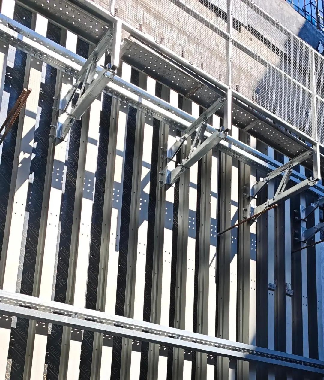 大模板凭借精密的支撑与紧固系统,可高效抵御新浇混凝土产生的侧压力,显著降低模板变形、鼓胀风险。相较于小块散拼模板,大模板大幅减少接缝数量,经特殊设计与处理后,能有效防止漏浆问题,确保浇筑出的混凝土墙面平整光洁,完全契合核电工程对高品质混凝土外观的严苛标准。在项目施工过程中,少拉杆设计大幅缩短施工周期;上部操作平台的创新设置,既减少了脚手架搭设量,又避免了交叉作业干扰,显著提升结构施工质量、精度与效率,同步强化作业安全性,为混凝土振捣作业提供了便捷、高效的操作空间。