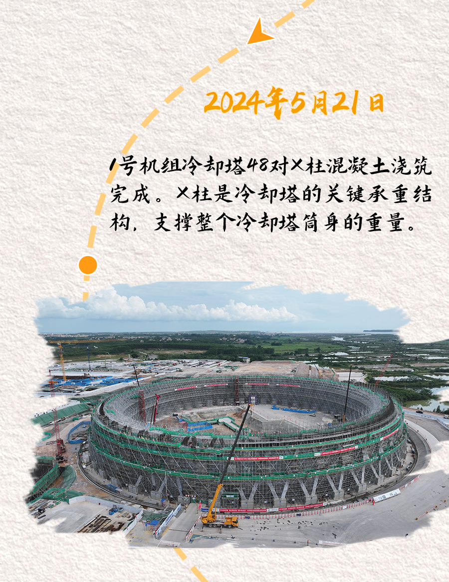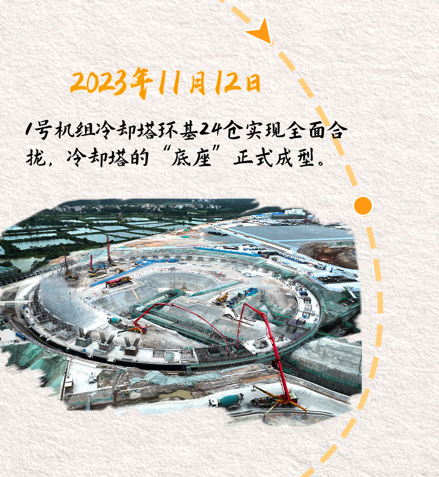 廉江核电1号机组冷却塔在国内核电领域尚属首个,塔高218.7米,零米直径174.6米,淋水面积达两万平方米,混凝土浇筑总量达13.74万立方米,该工程突破了多项技术瓶颈。