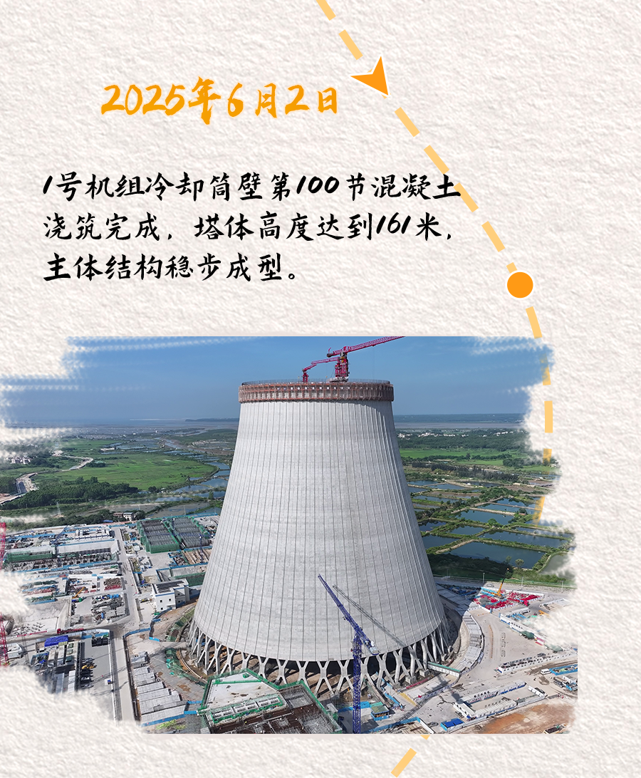 此次冷却塔的顺利到顶,为我国核电领域超大型海水冷却塔的设计和建造积累了宝贵经验,将进一步拓宽核电厂址开发的布局空间,为国家能源结构绿色低碳转型和“双碳”目标实现注入强劲动力。