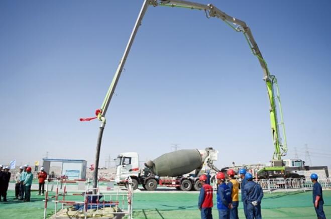 国网新疆电力施工人员在若羌—羚羊750千伏输电线路工程现场进行基础首基浇筑。