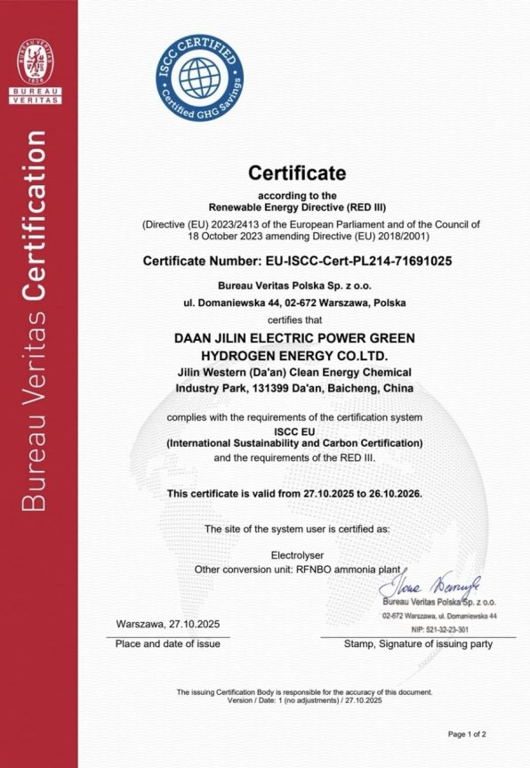 ISCC EU RFNBO 认证作为可再生燃料非生物来源氨的认证体系,覆盖原料、生产、应用全生命周期评估,其严苛标准成为国际绿色能源领域的通行证。大安项目通过认证,意味着绿氨生产技术、管理体系和碳核算标准,全面满足欧盟《可再生能源指令》(REDⅢ)要求。