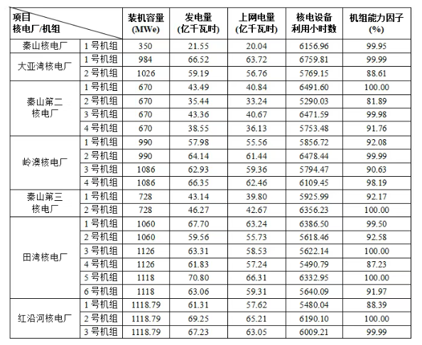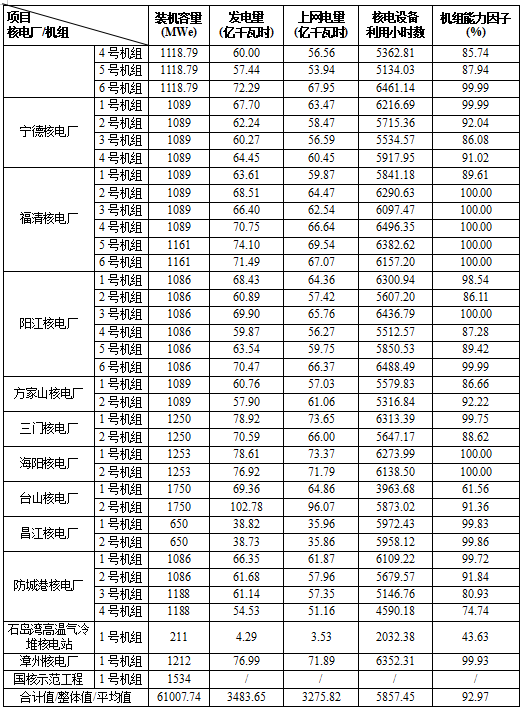 2)本表合计值/整体值/平均值中,装机容量、发电量、上网电量为各机组合计值,核电设备利用小时数为全部机组整体值,机组能力因子为全部参与统计机组的算数平均值。