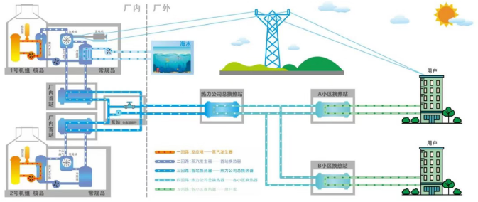 核能供热清洁高效、安全可靠。暖核一号(荣成)的主要原理是从核电机组二回路抽取蒸汽作为热源(此热源没有放射性),通过厂内换热首站进行汽-水热交换后,被加热的水向地方热力公司荣成市天颐热电有限公司、荣成市热电厂有限公司提供热源,再由换热站进行水-水热交换后,经热力管网系统向用户供热。整个过程中,只有热量的传递,没有水的交换,确保核能供热安全可靠。